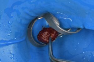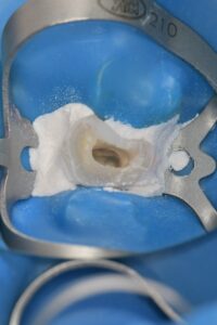 ラバーダムに高濃度の過酸化水素とポピドンヨードを用いて消毒を行い無菌的な環境が完成となります。